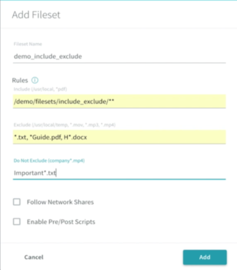 Filesets can be customized to meet specific needs including the ability to call Pre/ Post Scripts to a.o. provide application-consistent backups. Welcome to the future! 😉
