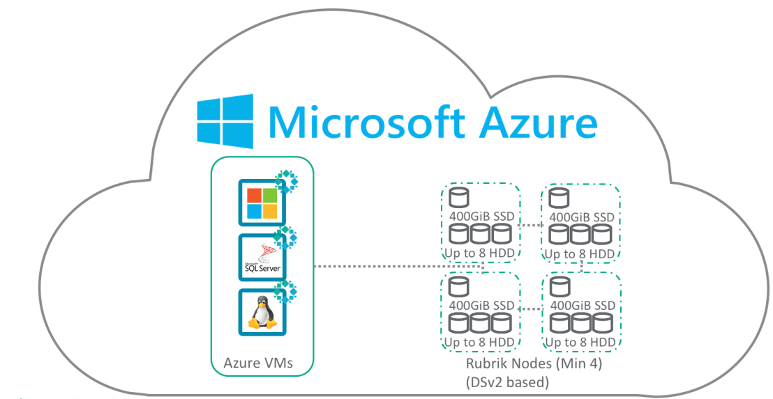 Since Rubrik CDM v3.2 we support running a 4-node (minimum) cluster in Microsoft Azure. We use the DSv2-series VM sizes, which gives us 4 vCPU, 14GiB RAM, 400 GiB SSD, and a max of 8 HDDs per VM.
